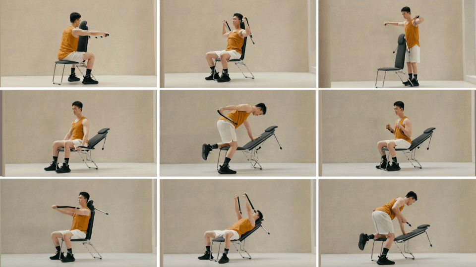 Transform your chair into a Pilates machine, rowing machine, power rack, and yoga chair all in one. (4 in 1)
